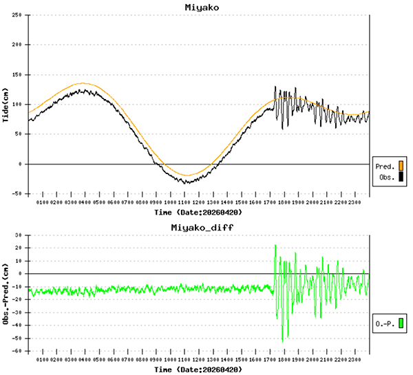 海上保安庁 海洋情報部 の宮古リアルタイム潮汐データの17時35分頃のデータ。第一波が観測されている。30cm位。
