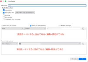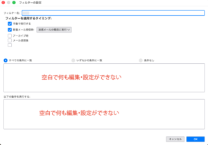 Mac のThunderbirdのメッセージフィルターを設定しようとすると、フィルターの条件と動作の設定ウインドウが空白で入力できない。いつからかわからないが、現在のバージョンは146.0.1 (aarch64)である。以前に作ったフィルターは有効だが、編集しようとしても編集できない。macOS26 Tahoe だからか?