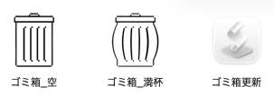 ①アイコンを用意する。ネットでMac ごみ箱とかで検索してごみ箱のアイコンを探す。ごみ箱が空のときのアイコンとゴミが入っているときのアイコンである。アイコン同士に関連がある必要はないから好きなものを選ぶ。空と満杯の絵がペアになっているのはあまりない。