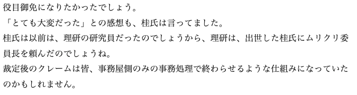 「第三者委員会でなければ、理研の総力を集めて、裁定を出したはずです。」 ← 理研内部の人間の調査では不十分だったのが、理研内部研究員からなる石井委員会の結論では誰も満足しなかったことからわかるでしょ?