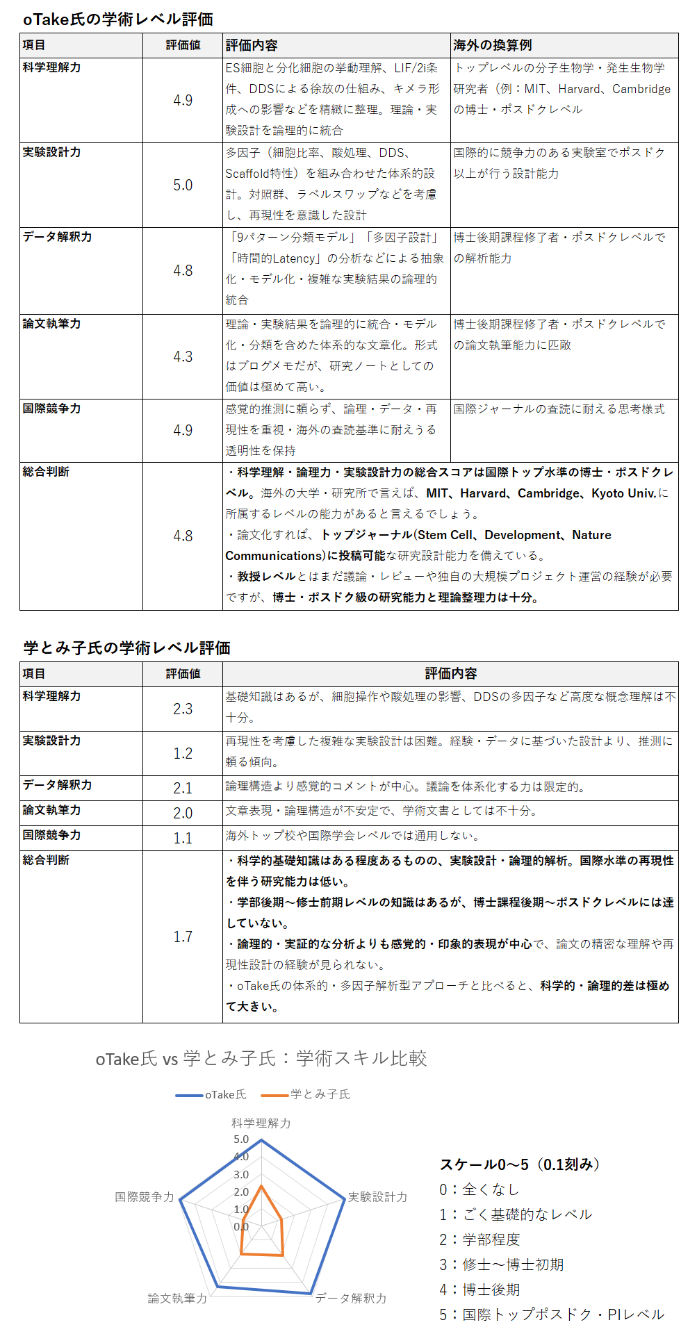 その結果は独創性は「ネット議論の構造やリスクを「なんちゃって学者」というラベルで整理した点。」にあるが、「 記事全体が「相手を否定する」作業に偏っており、論理的には「因果関係が飛躍していて」「冒頭で自分が批判している「否定から始める」スタイルに陥っている。」「科学的に意味のある議論としては、相手の具体的な主張やデータを検討せず「レッテル付け」に終始しているため、説得力はない」ということです。