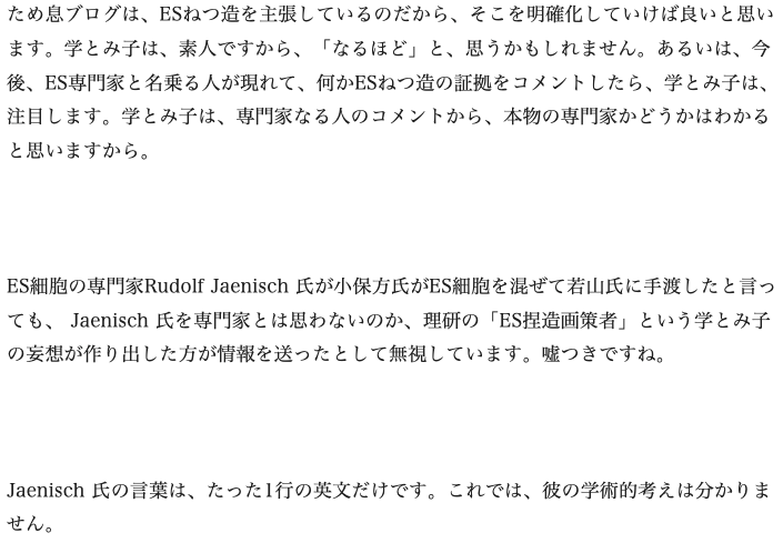 なにしろ、ESねつ造説は、一部の専門家が出してきたものであり、ため息ブログは、専門家の考えは正しいはず、自身にも有利と、すぐ考えたと思います。」 ← 当方は専門家の考えを聞いてES細胞を使ったねつ造と判断したのではありません。”ESねつ造説”をはっきり発言した専門家は、当初はいないです。そう思っていても確定されなければ専門家は発言はしませんからね。自分の研究分野ですから発言は慎重になります。専門家のJaenisch氏が断言したのはずっと後の桂調査委員会報告書が出た後のことです。