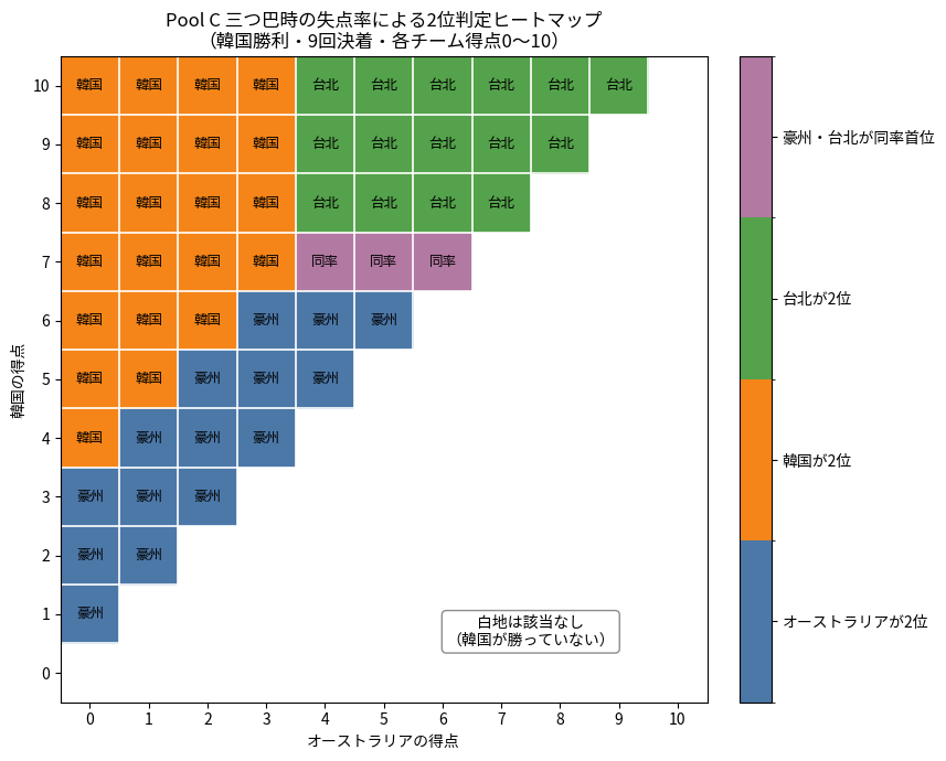 オーストラリア対韓国戦でそれぞれの失点で2位が決まることになる。オーストラリアが勝ったら計算する必要がなく、引き分けもなく、9イニングで勝負が決まるとして、オーストラリアの得点を横軸に縦軸に韓国の得点とし、原点はそれぞれの0点としたときのヒートマップを作成してください。現実的にするために両チームの得点は10点まででいいです・凡例の色を間違えず、図の文字化けがないようにしてください。失点率が同じになる場合があるかとおもいますがどうでしょうか?
